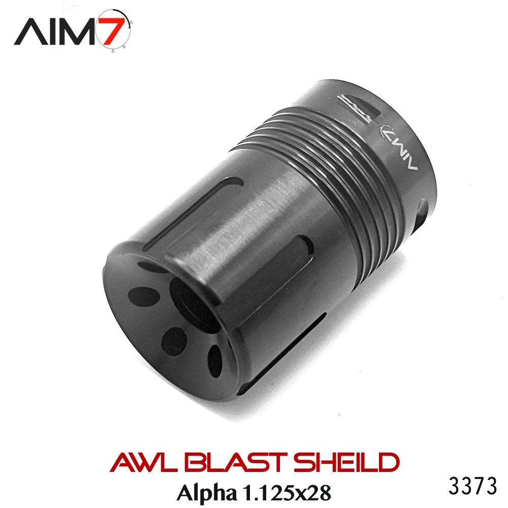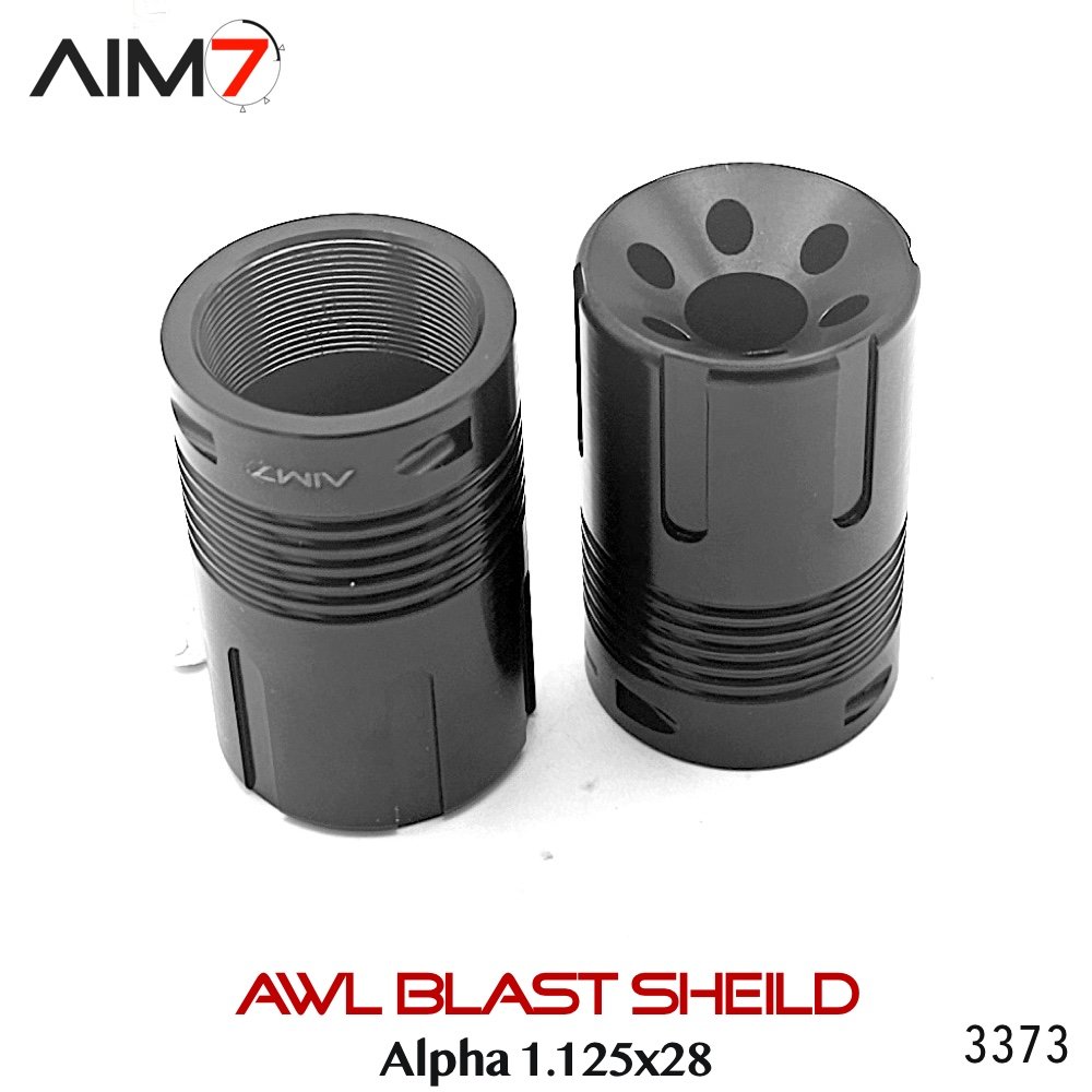 The AIM7 AWL Blast Shield is a precision CNC-machined front-cap accessory for Alpha-pattern front-cap/tube systems. Machined from T6 aluminum and finished for durability, the AWL installs on 1.125×28 (Alpha) external threads and provides a low-profile shield for forward blast while delivering a clean, finished interface. This listing is for the blast shield only.